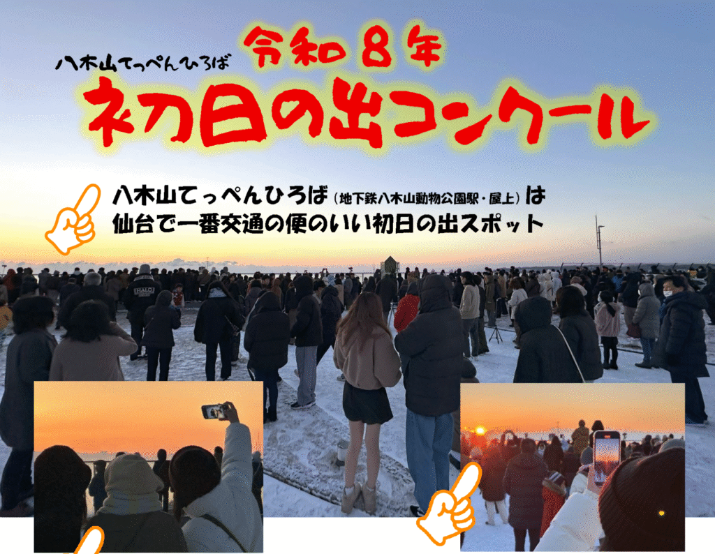 地下鉄を降りて改札を出て、エレベータで屋上に上がれば、そこは太平洋まで見渡せる初日の出のスポット。「仙台で一番交通の便が良い初日の出スポット」を自称する「八木山てっぺんひろば」には、毎年2,000人の人が集まります。以下に元旦当日の八木山てっぺんひろばの様子をアップしました。