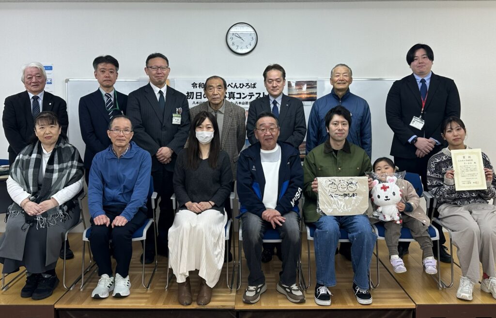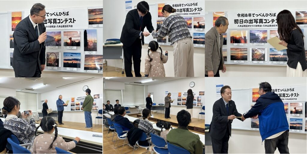2月14日(土)の9時30分から、八木山市民センター3階で令和8年度の初日の出写真コンクールの表彰式が執り行われました。残念ながらインフルエンザで欠席のお二人を除き、受賞されたみなさんは、直接、各団体のトップから表彰状と記念品を授与されました。